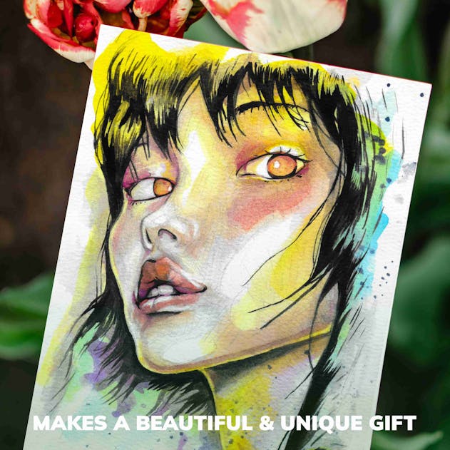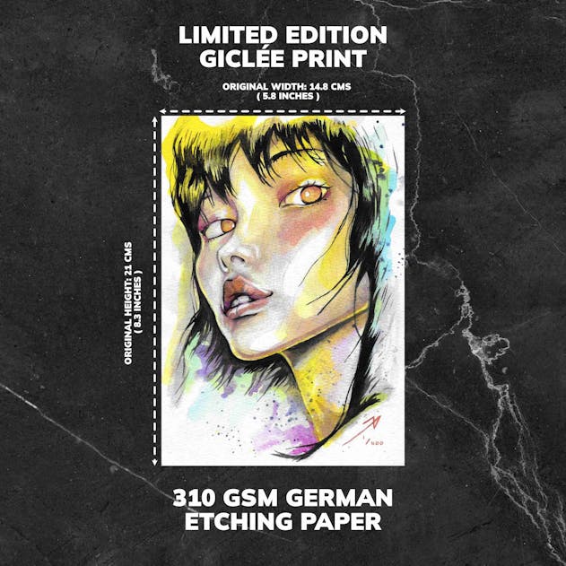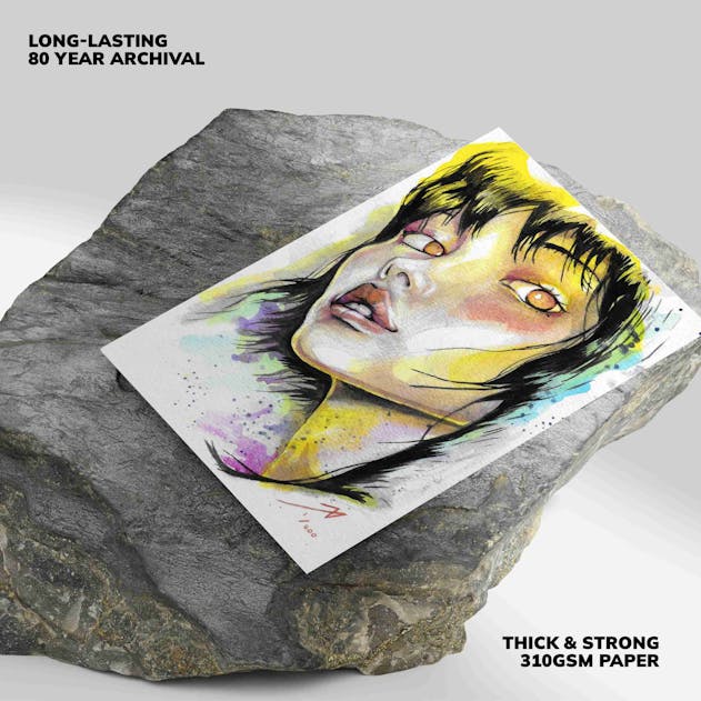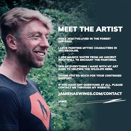 The original watercolour is painted on 5.8-inch by 8.3-inch (14.8 cm by 21 cm) thick 300 gsm watercolour paper, using professional grade watercolours mixed with holy well water.