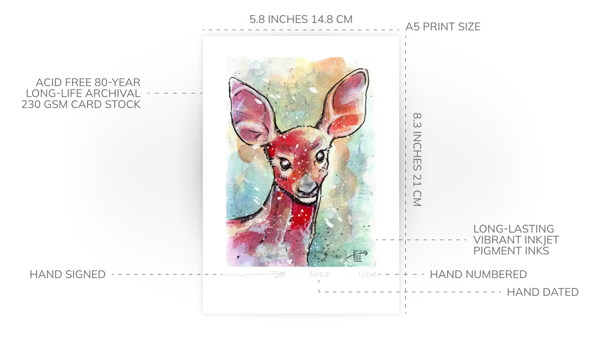 Each print I make is a high-quality, 80-year archival Giclée print. I use 230 g/m² gallery-quality card stock.